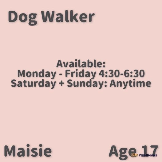 Hi! I’m Maisie and I’m 17. I have experience with a variety of animals and absolutely love all animals. I am willing to work with all breeds and can offer low prices. I am available to work Monday – Friday from 4:30 until 6:30 and Sat and Sun all day. Unfortunately I cannot travel very far but can travel some distance. Thank you and contact me with any questions.