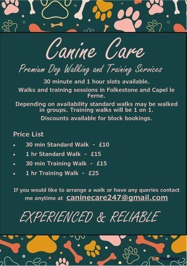 Dog walking and training in Folkestone, Hythe and Capel. 3+ years experience in walking, training and dog daycare. Fully insured. Dog first aid certified. *** ALL NEW CLIENTS 50% OFF FIRST 5 WALKS! *** For more information, quotes or inquiries contact caninecare247@gmail.com or text 07376969387.